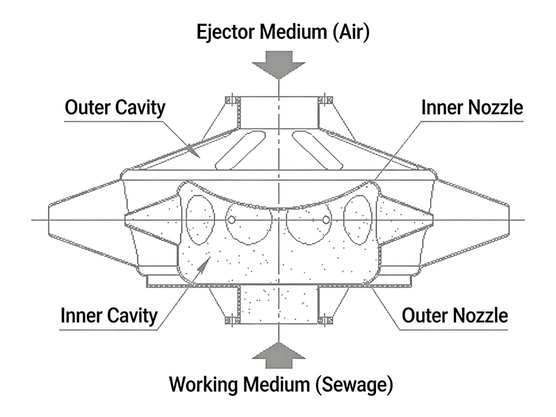 During operation, liquid is discharged at high velocity through the inner nozzle, forming a powerful jet flow. Due to intense turbulence and energy exchange generated by the jet, the liquid rapidly mixes with the air drawn into the outer chamber. Oxygen is transferred almost instantaneously from the gas phase to the liquid phase, resulting in a high oxygen utilization efficiency.